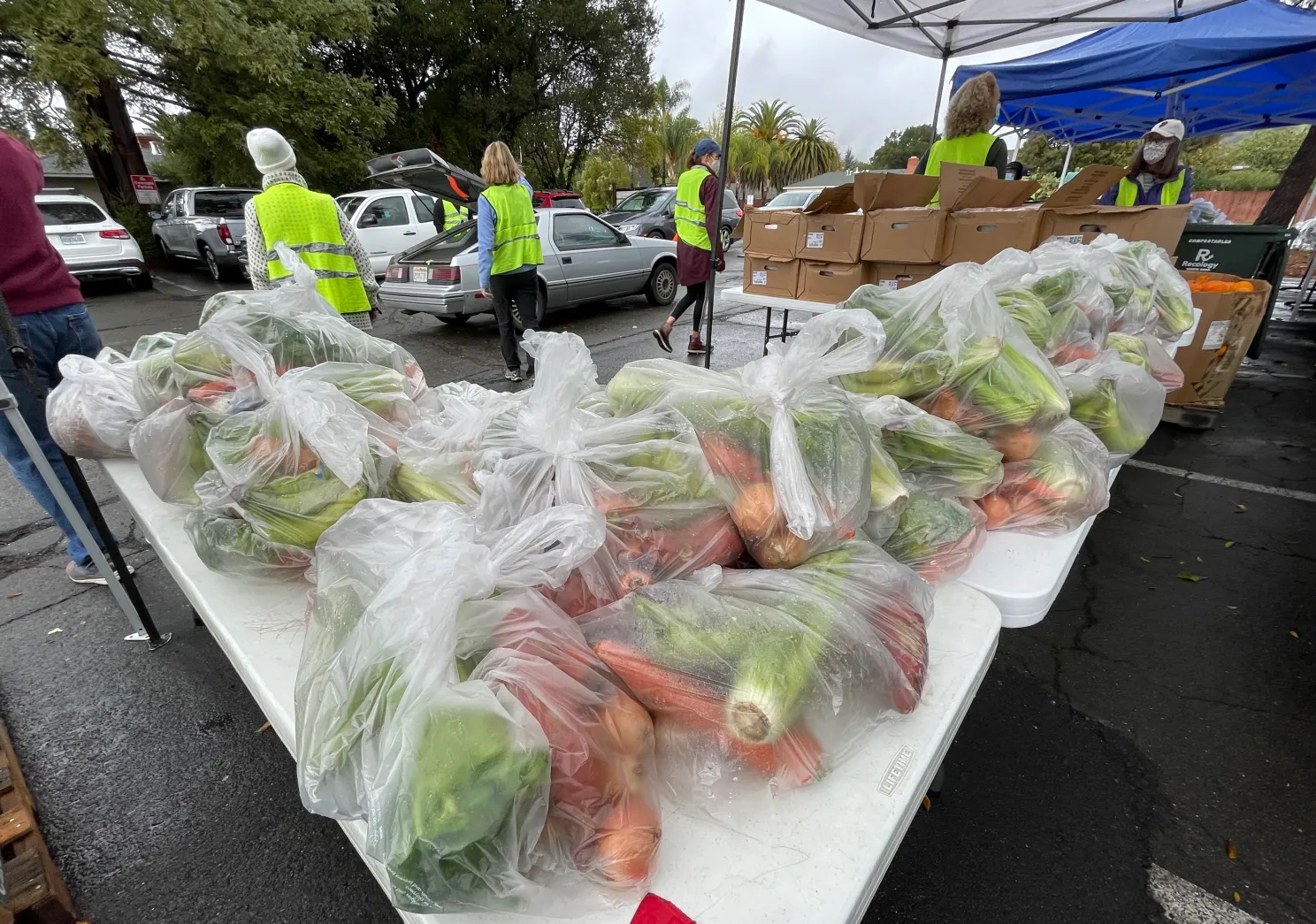 A crew distributes provisions during the weekly food pantry at North Marin Community Services in Novato on Tuesday, Nov. 9, 2021. (Alan Dep/Marin Independent Journal)
