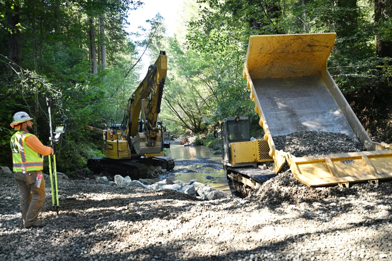 A crew dumps gravel into a stretch of Lagunitas Creek at a Marin Municipal Water District salmon habitat restoration project in Lagunitas, Calif., on Tuesday, Oct. 8, 2024 (Sherry LaVars/Marin Independent Journal)